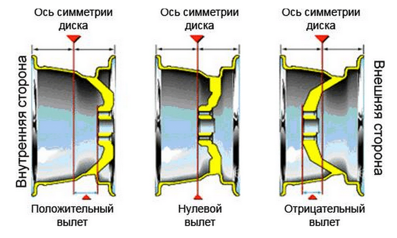 Исходя из этой формулы следует, что вылет диска может быть положительным, нулевым и отрицательным. Кроме того, вылет дисков фактически непосредственно влияет на ширину колесной базы, ибо от этого параметра напрямую зависит расстояние между центрами симметрии (по ширине) колес на одной оси.